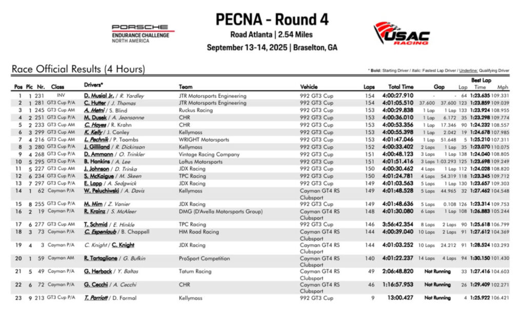 “It was a special moment for me to get to share the car with Matt for his first endurance race,” Jeansonne said. “Porsche Endurance Challenge always seems to bring out some of the best pro and am talent on track. For us to finish second in a strong field is something to be proud of. And the strong drive has given me a lot of confidence going into my next Carrera Cup rounds at Indy.”